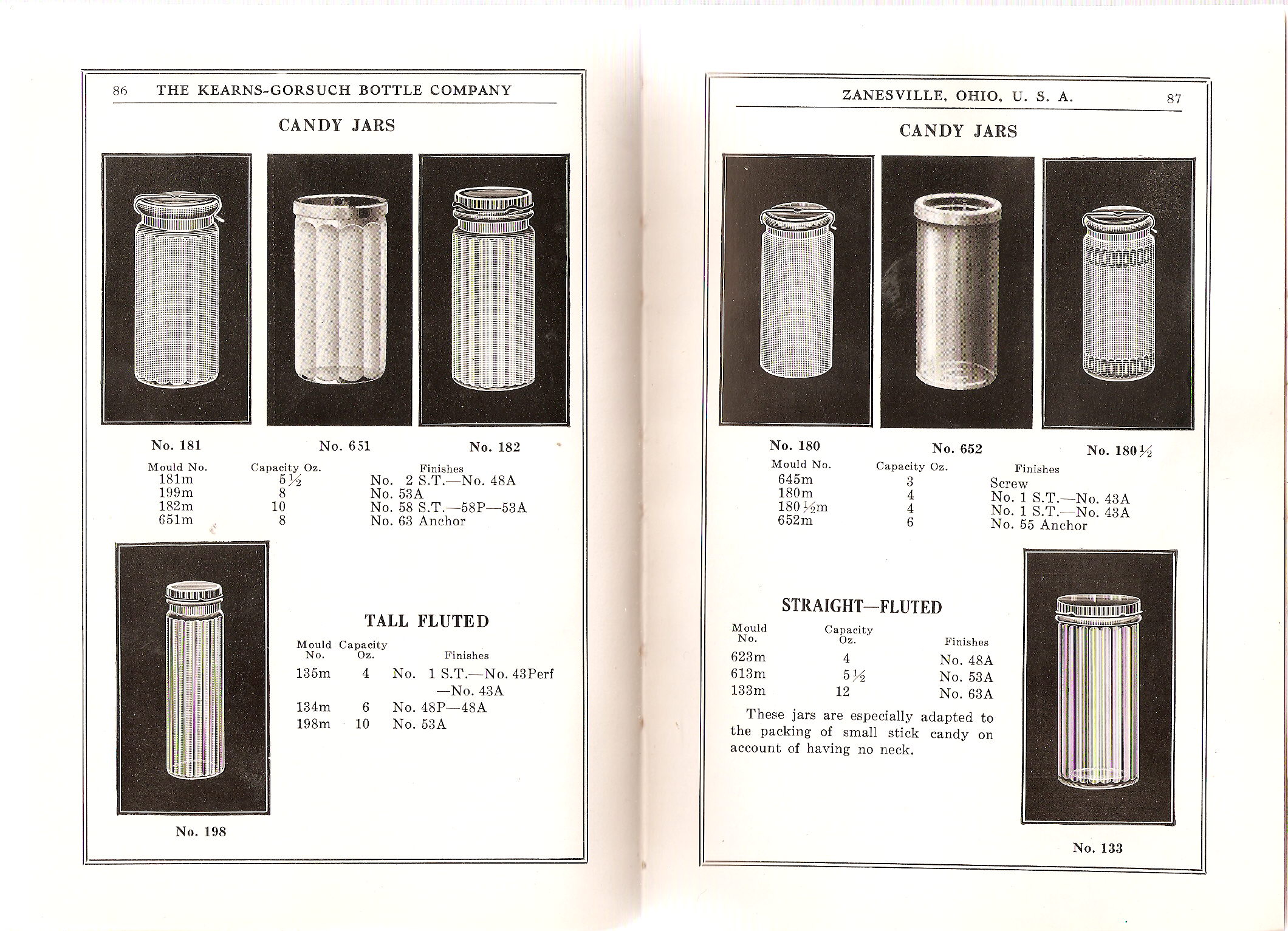 For additional information on the bottles this company made, see the recently published book (2011) entitled Zanesville Glass by J. William Barrett II. Scores of illustrated bottle catalog pages from the 1908 and early 1910s (approximate; both catalogs are undated) KGBCo. catalogs - those pages which are not repeated in the following 1916-1917 catalog (which is reproduced in its entirety) - are reprinted in the later portions of this book. Zanesville Glass (an exceptional work!) also includes various bottle listing illustrations from a 1920 KGBCo. catalog as well as information from catalogs published in 1926, 1929 and 1931 after the company was acquired by Hazel-Atlas (1920). A comparison of these various catalogs makes for an interesting study of the time progression of designs, sizes, finishes, and much more. (See the References page for an email link to contact Bill Barrett about the availability of this fine work on all the various Zanesville, OH. glass makers and their products.)
