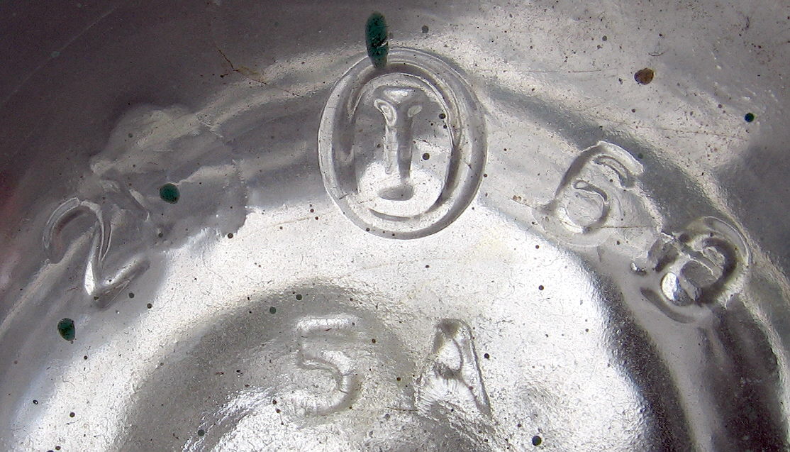 When present, however, makers marks - in hand with answers to the other questions noted prior - will often allow for a distinct narrowing of the date range in which a given bottles was likely produced. For example, the mark to the right inside the white box is the ubiquitous marking used by the Owens-Illinois Glass Company from 1929 or 1930 until the mid to late 1950s (ending time dependent on the bottle type and/or production factory). This bottle actually dates from 1941 as discussed in Question #11 above. As one can see, when present makers marks can be one of the best dating tools of all!