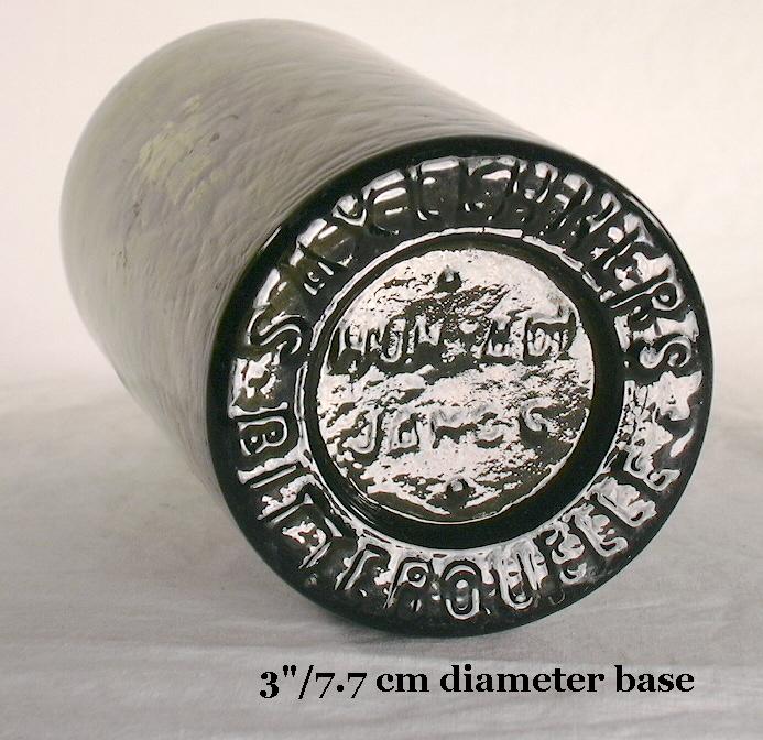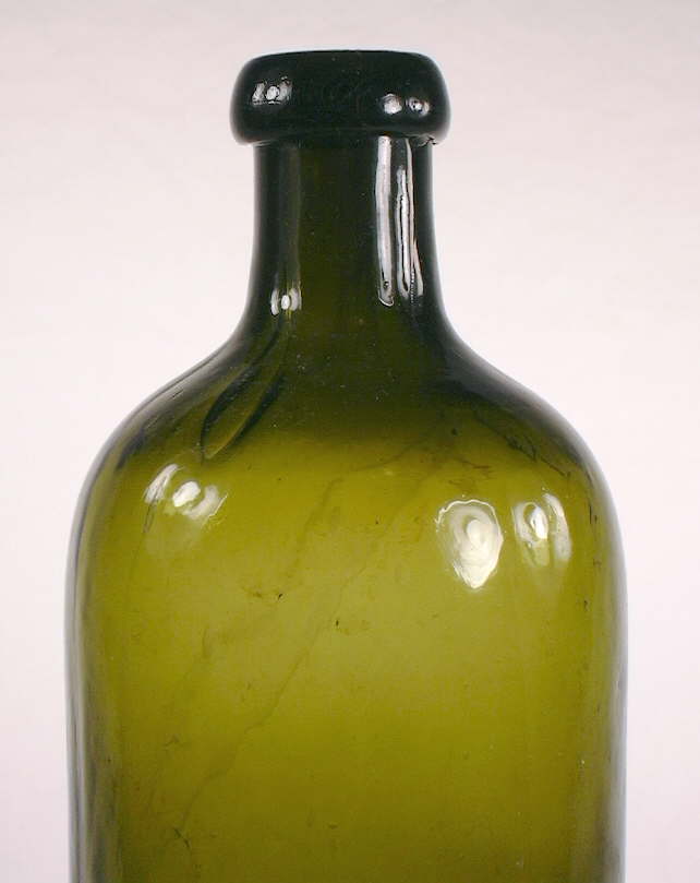 The almost black (dark emerald-olive green) "quart" Saratoga style bottle to the left is embossed CLARKE & WHITE / NEW YORK and is a somewhat later container from the same company as the John Clarke bottle above, most likely made sometime between 1856 to 1866. It has a mineral finish (though this example has a sparse lower collar most likely due to insufficient glass application for finish forming), no pontil scarring (though some types of Clarke & White bottles do have iron pontil scars commensurate with the noted date range), and was blown in a post-bottom mold with no air venting (Tucker 1986). This bottle is very crude throughout the body with lots of bubbles and waviness (i.e., "whittle marks") to the glass and has rounded (i.e., not sharply defined) embossing - all attributes consistent with the noted production period. Since this bottle does not have a pontil scar it likely dates from the latter half of the noted period, i.e., early to mid 1860s. (This is an example of the dating refinement possible with the presence or absence of various diagnostic features.) Click on the following links to view more pictures of this bottle: base view; close-up of the shoulder, neck, and finish.