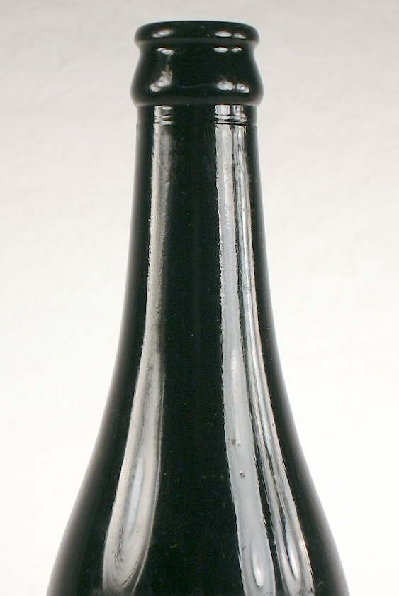 The blob-top soda style (aka "pony" or "soda shape" - discussed below) is typified by being cylindrical in cross-section (or sometimes multi-sided like the octagonal bottle to the left), with a variably long steep shoulder which blends gradually into a relatively distinct moderate length neck, topped with one of a variety of one-part blob finishes with very subtle differences (two of which are shown in the two pictures below). As usual, the easiest way to become oriented with this style is to study the pictures found here. The style is generally referred to as a "blob" or "blob-top" style soda/mineral water by collectors, though of course "blob" is a finish type that can be found on a relatively wide array of bottle types including some of the soda/mineral water bottle styles addressed later. The name "blob-top soda" has become widely accepted with only a few alternative names noted, though the term was never used by bottle makers. One slight name variation is "true blob" and some historic archaeologists have called it the "standard style" soda bottle, though this latter name has not particularly caught on (Paul & Parmalee 1973; Schulz 1980; Fowler 1981). Von Mechow (2009) defines two subtle variations on this style - the "soda shape" with a more abrupt, shorter shoulder (somewhat like the image to the above left) and the "pony shape" with a longer, more sloping shoulder (image below right) although the break between these two variations is hard to precisely define. (Consult Von Mechow's excellent website for more bottle shape information: http://www.sodasandbeers.com/SABBottleShapesSoda.htm )