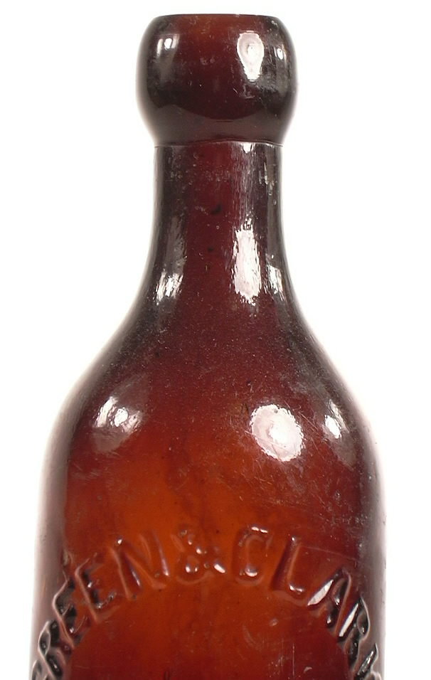The English Codd bottle pictured to the above left is embossed NORTH LINDSEY / MINERAL WATER CO. / SCUNTHORPE. It is also embossed on the reverse REDFEARN BROS / BOTTLE MAKERS / BARNSLEY indicating that the bottle was made by this glass company - business dates unknown. The towns of Barnsley and Scunthorpe are located in central England so of course this bottle is English made, most likely during the late 19th century, i.e., 1880-1900. It has a crudely applied long tapered (outwards towards base) "oil" type finish (for want of a better finish fit) with a groove on the inside of the bore for the gasket which the marble sealed against; a ubiquitous finish on a Codd bottle. Some residual gasket is remaining as shown in the picture. The bottle has no apparent evidence of air venting and was blown in a post-bottom mold. These features would date the bottle - if U. S. made - from the 1870s to mid-1880s. However, as noted on other portions of this website, European manufacturers were "behind" the U. S. in adopting new bottle production techniques so it is possible that this Codd bottle could date as late as 1900-1915 as Codd bottles from that era are known with these diagnostic traits. It could also date from the 1880s also and would need local research on the company (or glassmaker) history to pin down the date more. Click on the following links for more views of this bottle: base view; close-up of the neck and finish. Though English made, it is essentially identical to the bottles that were used infrequently by soda companies in the U.S.; bottles that were almost certainly made by English glass companies like Redfearn Bros.