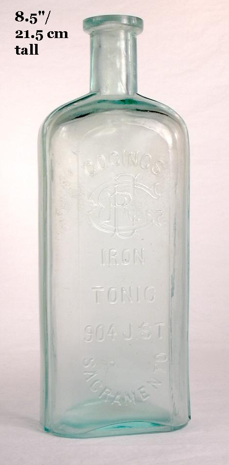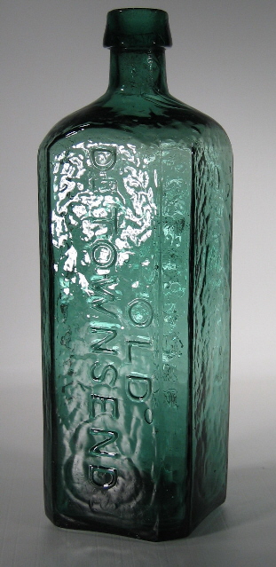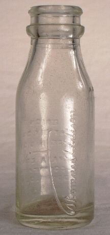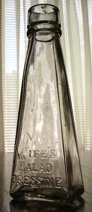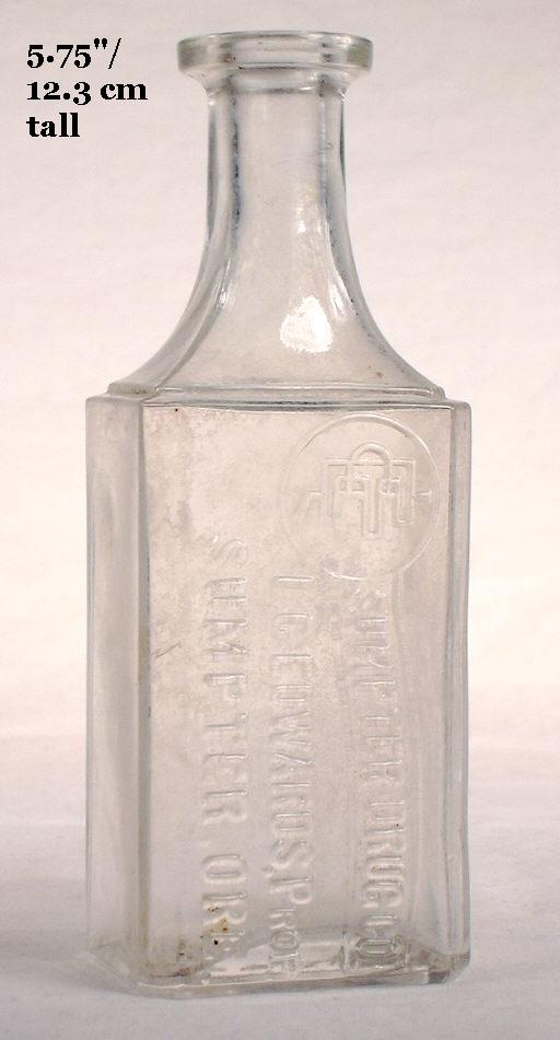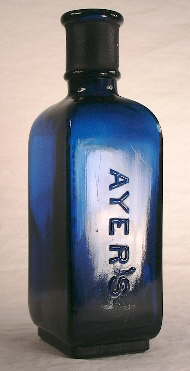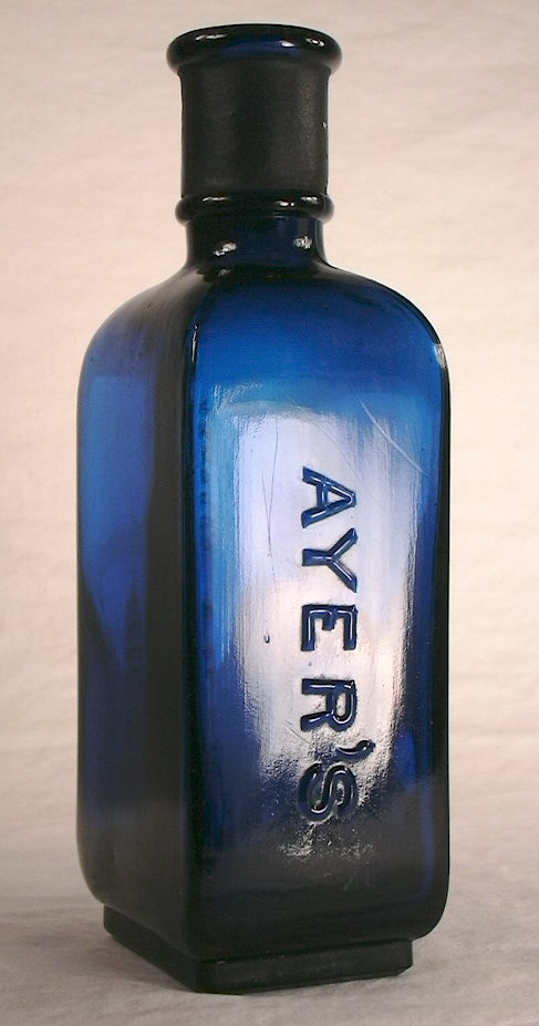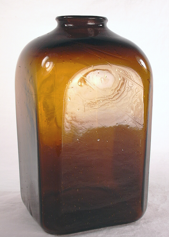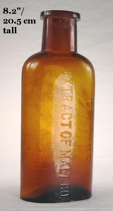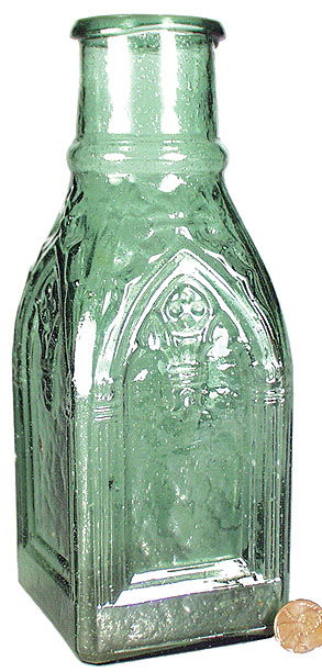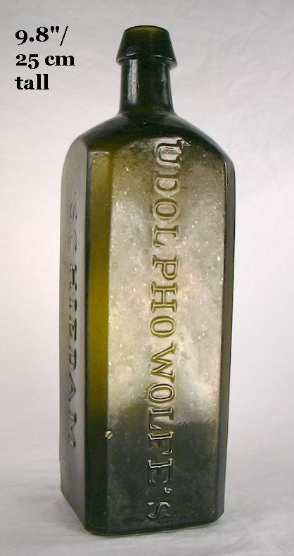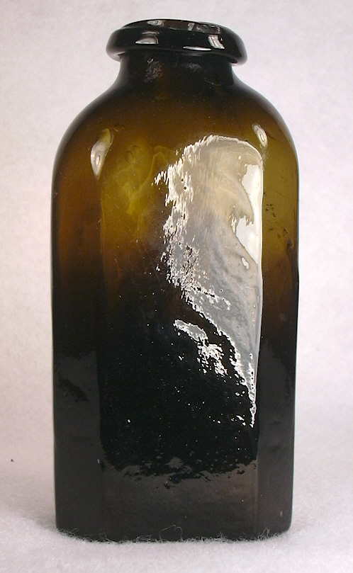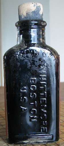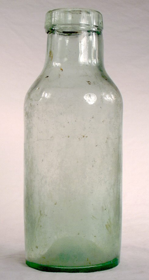 However, consumers of the time - just like today - looked for certain products in certain shaped packages. Because of this most users of bottles used some accepted or standard shape for a given product. A square, short necked bottle like that pictured below was very commonly used for medicinal products and in particular "bitters" which was a very popular type of usually high alcohol medicinal product during the 19th and early 20th centuries. This general shape was also used for "schnapps" - another high alcohol nominally medicinal product. In fact, early bottle makers called this shape either a "bitters" or a "schnapps" (Illinois Glass Co. 1903-04, Alther 1909). If the bottle is embossed (or labeled) with the product name or type, then one knows for sure what it originally contained. If the bottle is not embossed or labeled, then the shape can still be very indicative of what the contents most likely were. 2. Any given bottle could have been recycled and reused many times for totally unrelated products.