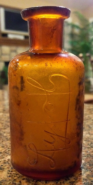 if one considers the tall, amber cylinder bottle pictured to the left which is embossed