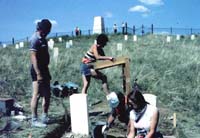 Archaeologists excavating in foreground; Custer Hill with granite memorial in background.